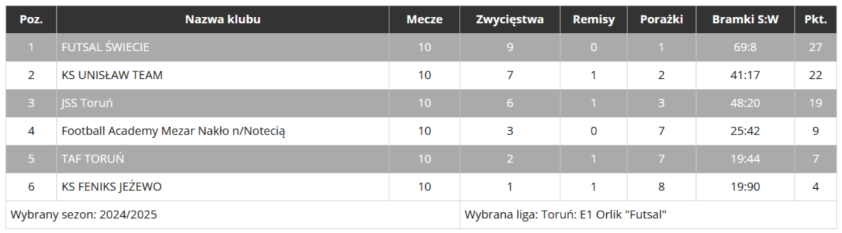 W sobotę w Jeżewie odbył się ostatni turniej ligi orlika w futsalu. Bez udziału najlepszej ekipy Futsal/Wda Świecie. Ten rozgrywki zakończył już 15 lutego podczas zawodów 5. kolejki w Ślesinie (gospodarz FA Mezar Nakło). Świecianie rozegrali tam tylko jeden mecz, ale kluczowy dla układu czuba tabeli. Pokonali Unisław Team 2:1, dzięki czemu zapewnili sobie 1. miejsce i tytuł mistrza województwa. Futsal/Wda otrzymał też trzy punkty walkowerem, bo na turniej nie dotarła TAF Toruń. Podopieczni Piotra Brachuckiego w całym sezonie odnieśli 9 zwycięstw i ponieśli tylko jedną porażkę (podczas inauguracji sezonu 21 grudnia z Unisław Team 0:2).