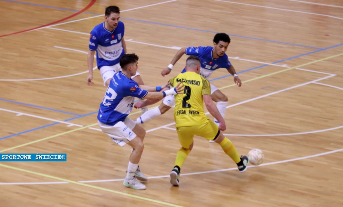 Futsal Świecie potwierdził dziś, że w grupie północnej I ligi PLF jest najlepszy w tym sezonie. Na dwie kolejki przed końcem zapewnił sobie historyczny awans do Fogo Futsal Ekstraklasy. W 20. kolejce Futsal rozbił Wiarę Lecha Poznań 10:4 (6:2). Zaczęło się po myśli gości, bo szybko dwie bramki strzelił najlepszy strzelec I ligi Uriel Cepeda. W 3. min. było 0:2. Jednak natychmiast z rzutu wolnego odpowiedział Karol Czyszek. Od tego momentu Świeckie Pantery zaczęły przejmować inicjatywę i już do przerwy praktycznie przyklepały awans, bo prowadziły 6:2. Karol Czyszek skompletował hat-tricka. Dwa gole (na 2:2 i 6:2) strzelił Piotr Kaczkowski, a jednego Marcin Mrówczyński (na 3:2, piękne uderzenie z ok. 14 metrów). Sztab szkoleniowy beniaminka z Poznania chyba nie odrobił zadania, bo nasz zespół trzy bramki w tym spotkaniu strzelił po zagraniach z rzutu rożnego i uderzeniach z pierwszej piłki. Dwa razy w ten sposób trafił „Kaczek”, a raz „Mrówa”. Wiara Lecha próbowała wrócić do gry. Miała swoje sytuacje. Blisko skompletowania hat-tricka był Cepeda, jednak przeszkodził mu w tym Oliver Zaręba, który w 17. min. wybił piłkę sprzed linii bramkowej.