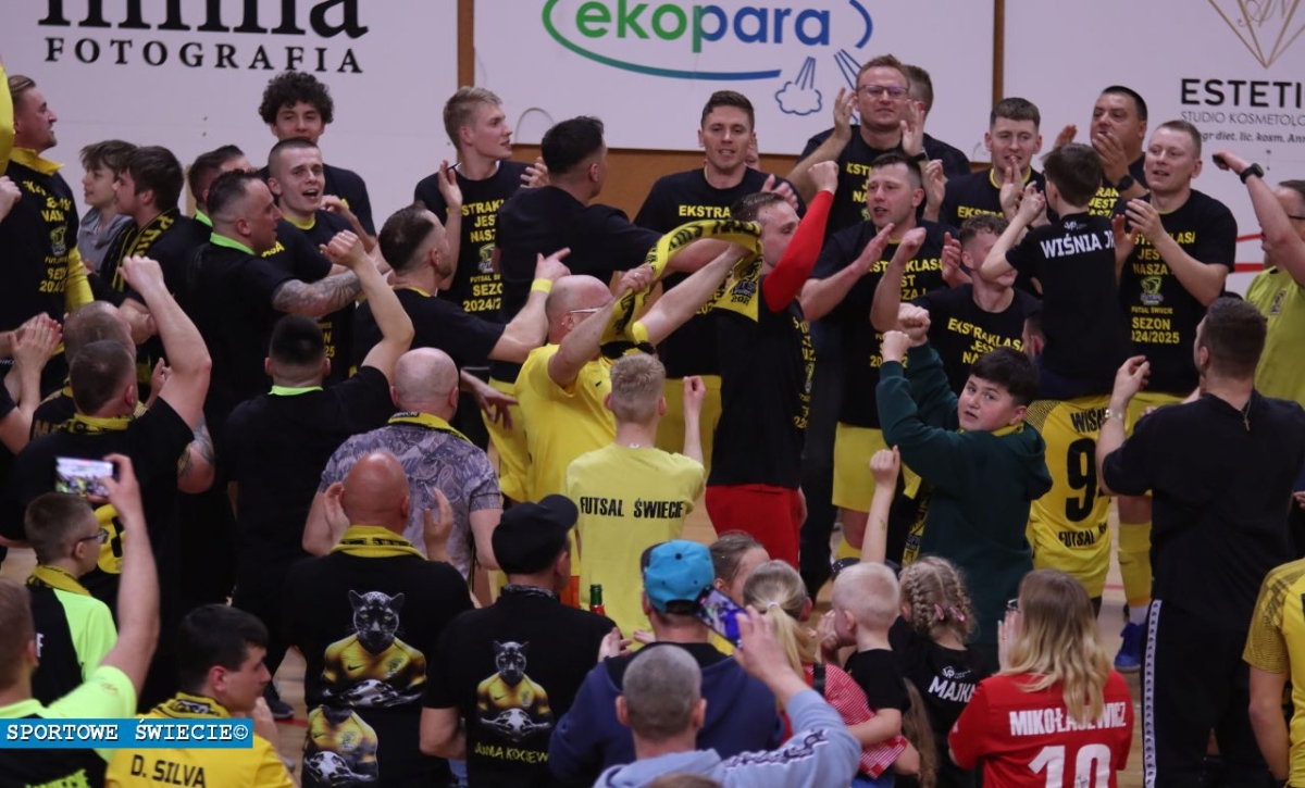 Po przerwie koncert lidera ze Świecia trwał w najlepsze. W 26. min. wygrywał on już 8:2 po golach Mateusza Cymana i Piotra Kaczkowskiego. Wówczas już w hali zaczęło się odliczanie do ekstraklasy, bo nikt już nie wierzył w to, że goście strzelą siedem goli. Przypomnijmy, że już remis dawał naszej drużynie mistrzostwo grupy 1. I ligi i bezpośredni awans do elity. W 32. min. goście zdobyli trzeciego gola (Olivier Knizs), ale to nie był koniec strzelaniny. W 36. min. po raz czwarty do siatki wicelidera piłkę posłał Piotr Kaczkowski. 120 sekund później nieporozumienie Marcina Mrówczyńskiego z Danielem Semrauem przyniosło samobója, lecz za chwilę Maciej Żurek strzałem z głowy ustalił wynik końcowy, a asystę zaliczył „Mrówa”. Później już było celebrowanie z kibicami historycznego awansu. Futsal Świecie jest w ekstraklasie.