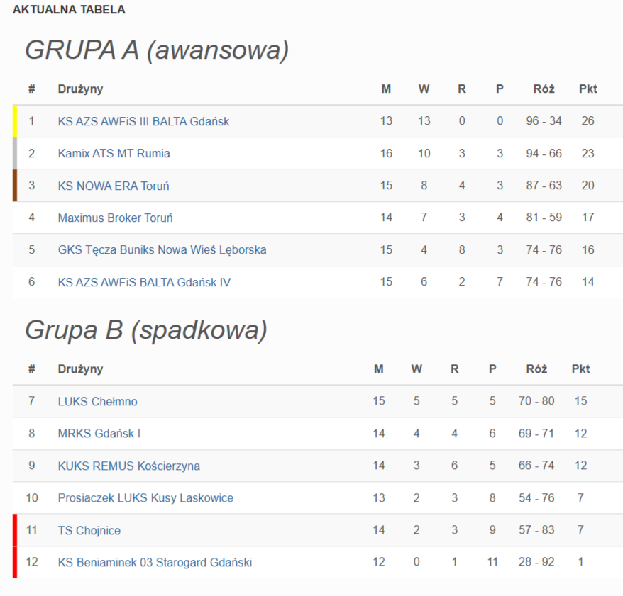 Inne wyniki grupy „spadkowej” – 12. kolejka: KS Beniaminek 03 Starogard Gdański - LUKS Chełmno 2:8, MRKS I Gdańsk - TS Chojnice 8:2.