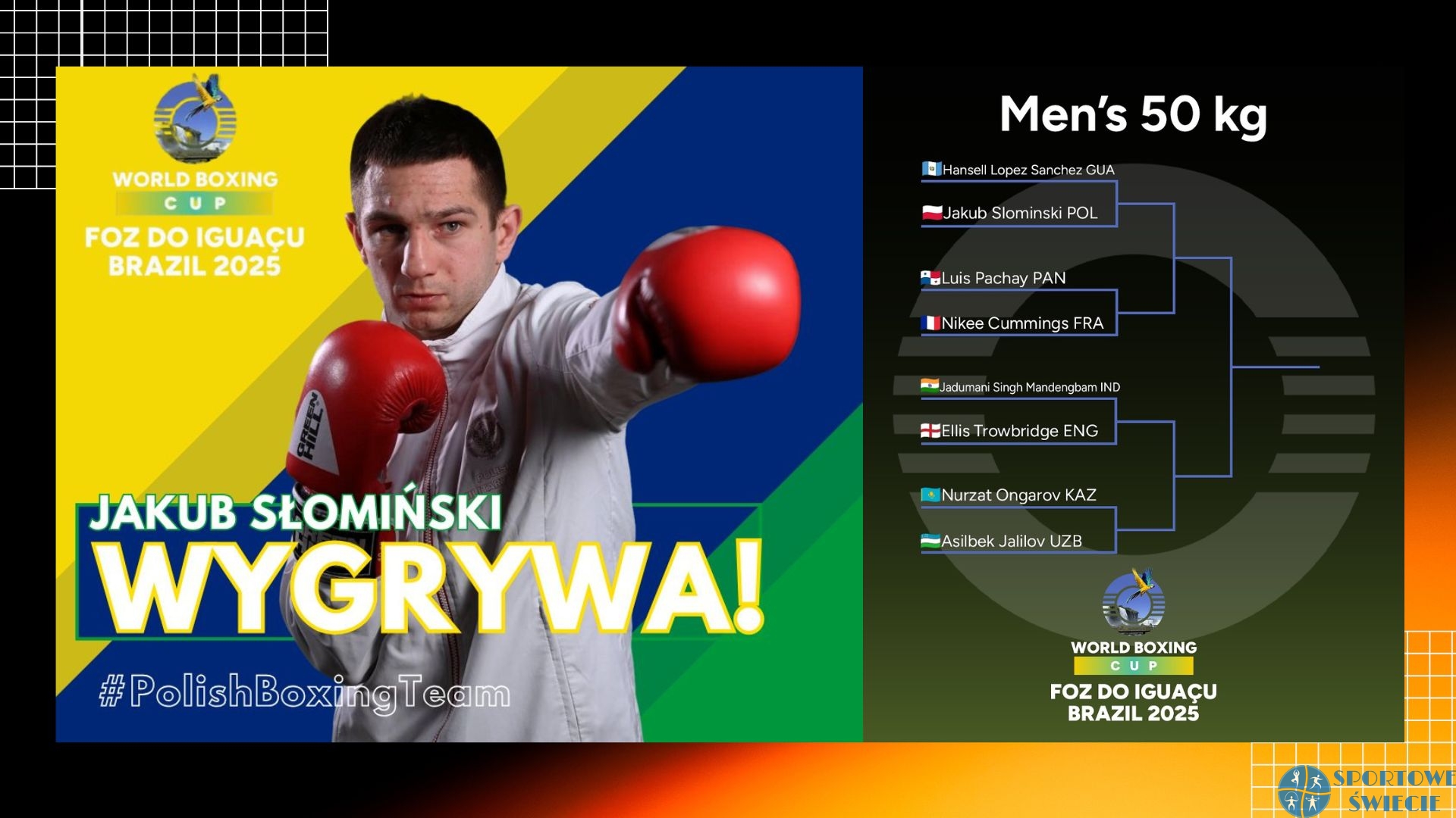 Świecianin Jakub Słomiński (50 kg) dobrze zaczął zawody Pucharu Świata w boksie, które od poniedziałku trwają w Brazylii. W nocy z wtorku na środę naszego czasu pokonał w ćwierćfinale Hansella Lopeza Sancheza z Gujany. Jak czytamy na profilu Polskiego Związku Bokserskiego „Jakub pokazał sprytny boks, nieustępliwość i świetną formę. Kontrolował cały pojedynek i pewnie sięgnął po zwycięstwo”.