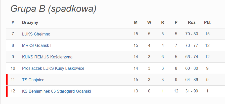 Po tych zaległościach Prosiaczek Kusy zajmuje 10. miejsce mając 9 pkt. Tyle samo ma TS Chojnice, ale przy jednym spotkaniu rozegranym mniej. Dodajmy, że ilu będzie spadkowiczów uzależnione jest od wyników barażu o awans do I ligi (grupa północna) oraz ilu pierwszoligowców z województw pomorskiego i kujawsko-pomorskiego zaliczy spadek. Zagrożone są drużyny z Gdańska i Solca Kujawskiego.