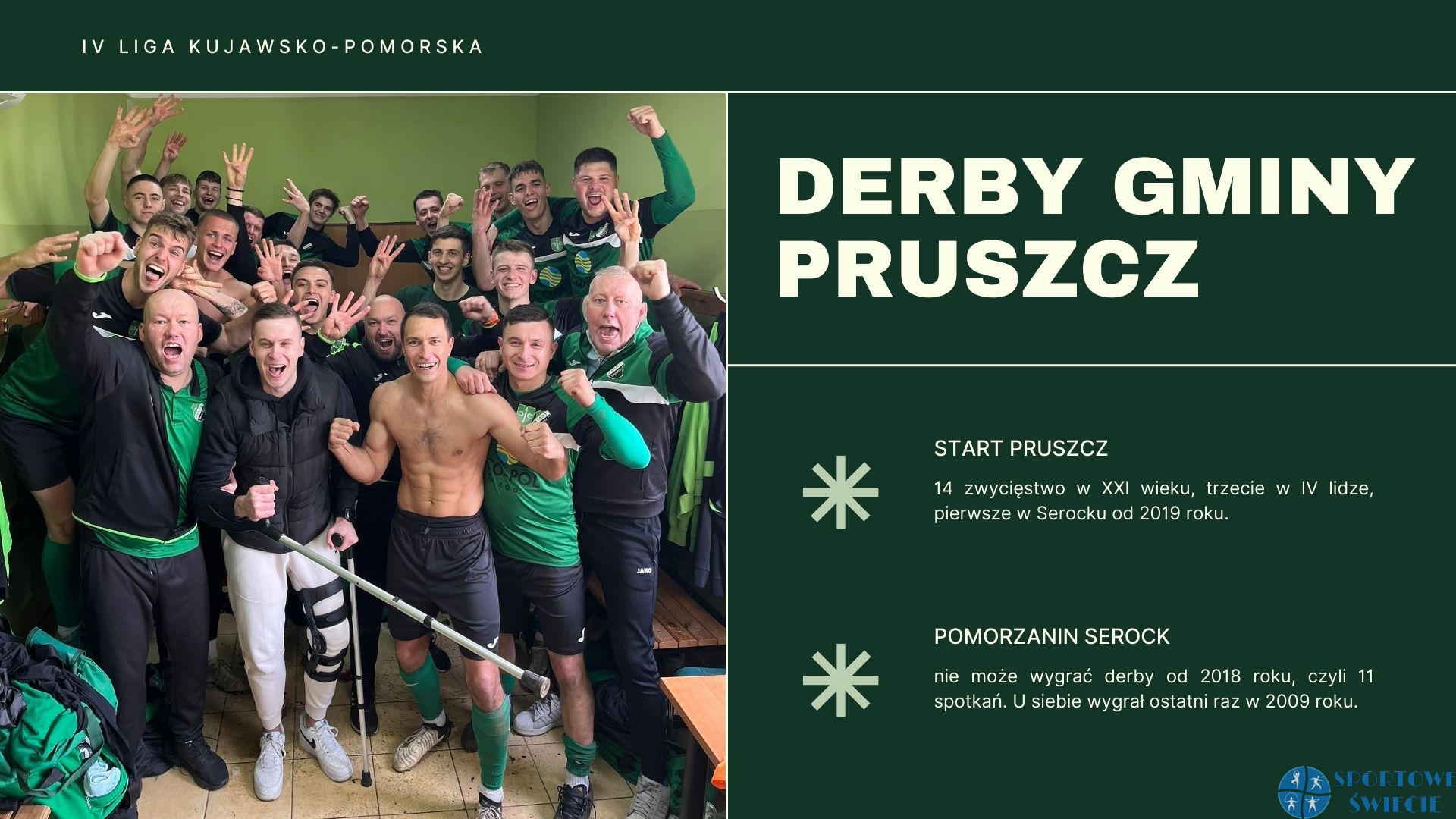 Pol-Osteg/Pomorzanin Serock uległ w sobotę Startowi/Eco-Pol Pruszcz 1:4 (1:0) w ramach 23. kolejki IV ligi. W tej klasie rozgrywkowej były to szóste derby. Dotychczas trzy razy padał w nich remis, a dwa ostatnie mecze wygrywali pruszczanie. Goście przyjechali w optymalnym składzie z debiutantem Maciejem Sieradzkim. U gospodarzy sytuacja kadrowa trochę poprawiła się, bo wrócili Mateusz Gorzycki i Wiktor Garczewski. Jednak zabrakło najlepszego strzelca wiosną Sergii Kravchenki. Do przerwy lepiej mecz ułożył się dla serocczan. Co prawda, w 25. min. kontuzji doznał Jakub Cielepak, ale w doliczonym czasie gry ładnym uderzeniem z ok. 25 metrów popisał się Konrad Witkowski. Piłka odbiła się od poprzeczki i wpadła do siatki. Do tego tuż przed zejściem do szatni drugą żółtą kartkę ujrzał Oleksandr Ovsiak i Start musiał grać drugie 45 minut w osłabieniu.