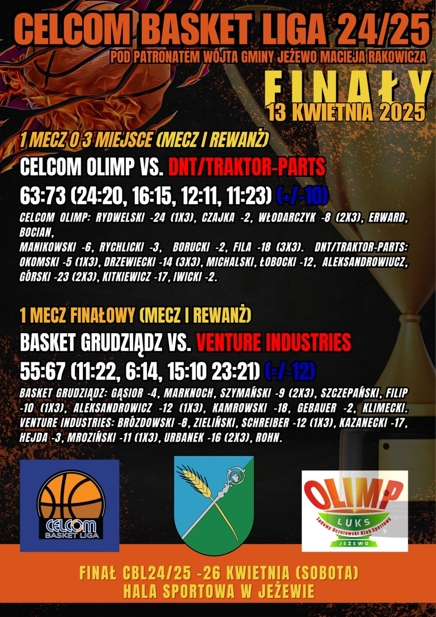 Koszykarze Venture Industries Grudziądz zrobili krok, żeby obronić tytuł mistrza Celcom Basket Ligi w Jeżewo. W pierwszym meczu finału (mecz + rewanż) wypracowali sobie 12 pkt zaliczki. Venture Industries wygrało z Basketem Grudziądz 67:57 (22:11, 14:6, 10:15, 21:23). Do wygranej obrońcę tytułu poprowadzili Łukasz Kazanecki – 17 pkt i Karol Urbanek – 16. Dla Basketu najwięcej punktów rzucił Kamrowski – 18.