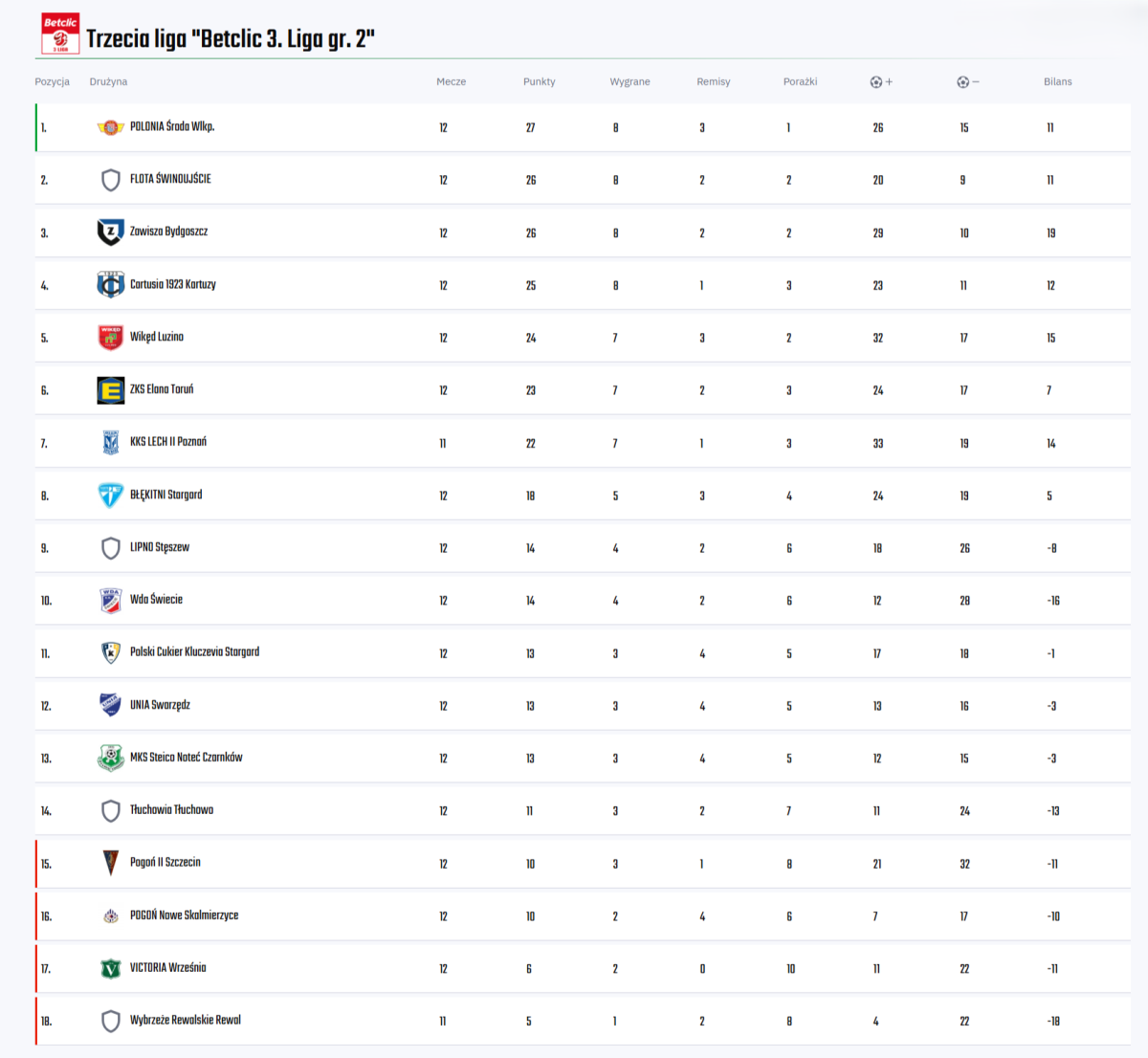 Wyniki 12. kolejki: Polonia Środa Wielkopolska - Wda Świecie 5:1 (2:1) - Rafał Steczyński 3 (8, 24, 74), Patryk Mikita (59), Damian Kołtański (87) - Michał Kalitta (32); Błękitni Stargard - Unia Swarzędz 1:1 (1:1) - Wojciech Fadecki (38-karny) - Tymoteusz Klupś (27); Cartusia Kartuzy - Kluczevia Stargard 1:2 (1:0) - Oktawian Skrzecz (40-karny) - Dmytro Jefimenko 2 (48, 78); Elana Toruń - Victoria Września 1:0 (0:0) - Oskar Sikorski (69); Flota Świnoujście - Zawisza Bydgoszcz 1:0 (0:0) - Patryk Paczuk (71); Noteć Czarnków - Lipno Stęszew 3:1 (1:0) - Michał Kuskowski (16), Klaudiusz Milachowski 2 (54, 59) - Jakub Rasiak (86); Pogoń II Szczecin - Tłuchowia Tłuchowo 2:3 (1:1) - Natan Ława (24-karny), Jacek Czapliński (88) - Dawid Kieplin (18-karny), Adrian Szczutowski 2 (67, 73); Pogoń Nowe Skalmierzyce - Wikęd Luzino 1:2 (0:1) - Marcin Manikowski (59-karny) - Filip Sosnowski (26), Dawid Konkol (66). Mecz Wybrzeże Rewalskie Rewal - Lech II Poznań przełożono na 22 października z uwagi na powołania piłkarzy Lecha do różnych reprezentacji narodowych.
