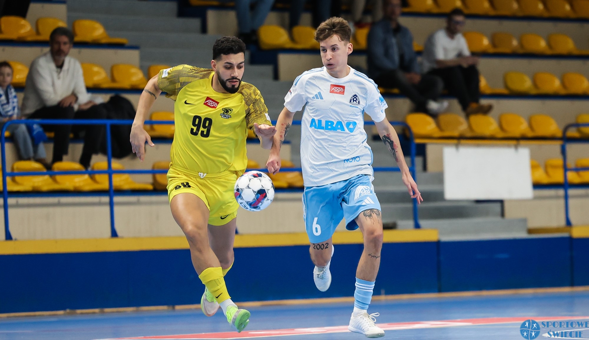 W 14. kolejce Fogo Futsal Ekstraklasy Ruch Chorzów wygrał z Futsalem Świecie 2:1 (0:0). Dla beniaminka z woj. śląskiego to pierwsze zwycięstwo w sezonie. Niebiescy potrafili wykorzystać to, że w naszym zespole zabrakło Krzysztofa Elsnera, Olivera Zaręby i Bartłomieja Piórkowskiego (są w Meksyku na Mistrzostwach Świata Socca) oraz kontuzjowanego Szymona Kocieniewskiego. Na szczęście wyleczył się Marcin Mrówczyński. Zgodnie z przewidywaniami u beniaminka z woj. kujawsko-pomorskiego zadebiutował Brazylijczyk Luiz Gustavo, który wyszedł w pierwszej „piątce”. To był mecz obu bramkarzy, a zwłaszcza Pawła Mury, który dokonywał cudów między słupkami. W sumie obronił 21 strzałów świecian. W 1. części zabrakło goli, choć oba zespoły miały po kilka okazji. Tavo był bliski zdobycia premierowego gola w Polsce w 7. min., ale trafił w poprzeczkę. Później zmarnował jeszcze jedną doskonałą okazję. Okazje mieli też Davidson Silva i Matheus Inacio. Chorzowianie również mieli poprzeczkę, którą obił Mariusz Seget. Ten zawodnik zmarnował najlepszą okazję w 15. min., gdy świetną interwencją popisał się Bartosz Piotrowski. Po 20 minutach Ruch miał na koncie 18 strzałów (7 celnych), a Futsal 21 (6 celnych).