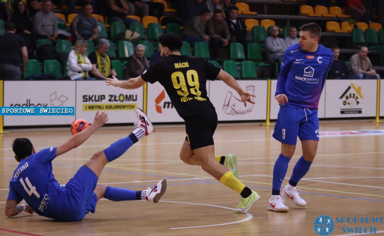 Futsal Świecie przegrał w 17. kolejce Fogo Futsal Ekstraklasy z Constractem Lubawa 3:8 (1:6). Lista nieobecnych u beniaminka była nadal długa. Co prawda, wrócił Davidson Silva, ale za to zabrakło Krzysztofa Elsnera (turniej w Katowicach z reprezentacją Polski socca) i trenera Marcina Mikołajewicza (wyjazd związany z pracą w wojsku). Drużynę prowadził Marcin Wanat. Poza tym ponownie nieobecni byli Mateusz Cyman, Oliver Zaręba, Maksymilian Lewandowski i Szymon Kocieniewski. Na domiar złego na początku spotkania urazu doznał Brazylijczyk Luiz Gustavo Przybyszeweski i nasz zespół grał w siódemką graczy. Zaczęło się obiecująco dla Panter, bo w 1. min. objęły prowadzenie. Z autu Tavo zagrał piłkę do Marcina Mrówczyńskiego, a ten „zawinął” obrońcę i oddał strzał. Piłka odbiła się od Matheusa Inacio i wpadła do siatki. Okazało się, że to były miłe złego początki. Wicemistrz Polski odpowiedział minutę później, a gola także po wznowieniu gry z boku boiska zdobył Adriano Lemos. Od tej pory goście zaczęli dominować i strzelać kolejne bramki. W 5. min. prowadzenie dał im Szymon Licznerski, któremu asystował Dawid Mataja. Cztery minuty potem na 3:1 trafił Kacper Sendlewski. Świecianie próbowali odpowiedzieć. Dwa razy groźnie uderzał z dystansu Mrówczyński, ale czujny był Roberto Gozi. Gospodarze zdecydowali się na grę z „lotnym bramkarzem”, ale ten manewr nie powiódł się. Po niecelnym strzale Karola Czyszka w 12. min. Gozi wznowił grę dalekim wyrzutem, a Chorwat David Mataja strącił piłkę klatą do pustej bramki. Po czterech minutach Constract zadał kolejny cios. Lubawianie dosłownie rozklepali naszą defensywę, a akcję sfinalizował Licznerski. Dwie minuty później Davidson Silva sfaulował w polu karnym Adriano Lemosa i sędzia wskazał na 6 metr. Rzut karny wykorzystał Szymon Licznerski kompletując hat-tricka. Wynik 1:6 utrzymał się do przerwy.