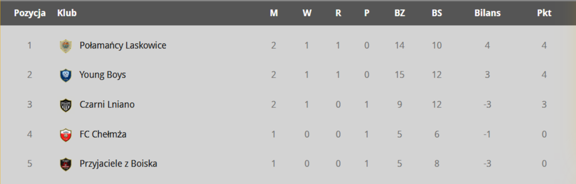 2. kolejka: Połamańcy Laskowice – Young Boys 7:7 (3:5) - Kacper Orczykowski 2, Kacper Furtak, Jakub Konieczka, Marcin Nikel, Maciej Spychalski, Krzysztof Kujawski (samobójcza – P), Sebastian Ambroziak 2, Patryk Doligalski 2, Łukasz Ciesielski, Sebastian Konieczny, Mateusz Janas (YB); Czarni Lniano – FC Chełmża 6:5 (5:3) - Mateusz Boniewicz 2, Kuba Boniewicz, Damian Niedzielski, Dawid Janka, Patryk Otlewski (Cz), Maciej Rzepkowski 2, Dawid Kotlarz, Kuba Boniewicz (samobójcza), Kamil Lewandowski (FC). Pauza: Przyjaciele z Boiska.