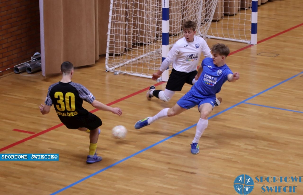 Toruńska Akademia Futsalu okazała się najlepsza w niedzielnym turnieju grupy 2. trzeciej fazy eliminacji do Młodzieżowych Mistrzostw Polski U19 w futsalu, który odbył się w Świeciu. Patrząc na jej dokonania w CLJ U19 to niespodzianka, aczkolwiek Torunianie na turniej wzmocnili skład, choćby bramkarzem Hubertem Rinkielem czy Daniilem Andriienko. Futsal Świecie także skorzystał z usług Krzysztofa Skomry (Start Pruszcz) i Maksymiliana Madeja (Chełminianka Chełmno). Za to zabrakło w „12” Mateusza Baranowskiego i Krzysztofa Gronowskiego. Podopieczni Davidsona Silvy na początek pokonali Beniaminka 03 Starogard Gdański 5:3 (1:2), a zdecydowało o tym pierwsze pięć minut 2. połowy, gdy strzelili cztery gole z rzędu wychodząc na 5:2. W drugim spotkaniu kibiców spotkał zimny prysznic. Futsal Świecie przegrał z nie grającym w CLJ U19 Jaguarem Gdańsk 2:4 (0:3). Nasi piłkarze popełnili sporo błędów w defensywie. Gdy zbliżyli się na 2:3 kosztowną stratę na środku boiska popełnił Szymon Taczyński, którą wykorzystał Wiktor Pionk. Mimo tej porażki szanse na awans były do końca, ale warunkiem była trzybramkowa wygrana z TAF Toruń. Wówczas o kolejności na miejscach 1-3 decydowałaby tzw. mała tabela. Niestety, gospodarze ulegli ekipie z Grodu Kopernika 2:7 (2:3). Po przerwie gra Świeckich Panter posypała się całkowicie. Dodajmy, że w tym turnieju grano 2x po 10 minut.