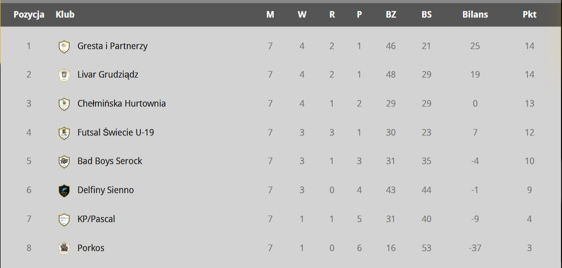 7. kolejka: Delfiny Sienno – Chełmińska Hurtownia Owoców i Warzyw 8:9 (7:5) - Antoni Chylewski 6, Kacper Sierszulski, Kacper Kiełpiński (D), Karol Nicieja 5, Przemysław Ernestowicz, Kacper Sierszulski (samobójcza), Wojciech Sondej, Jarosław Gaweł (H); Gresta i Partnerzy – Bad Boys Serock 7:2 (2:0) - Jakub Rządkowski, Patryk Klimek, Michał Kolano, Marcin Gałusza, Norbert Frankiewicz, Łukasz Szeląg (samobójcza), Dominik Zieliński (G), Kacper Russ, Artur Polasik (BB); Futsal Świecie U19 – Livar Śródmieście Grudziądz 3:3 (1:2) - Aleksander Olszewski 2, Oliwier Kasperski (FU19), Amadeusz Olszewski, Denis Rienkiewicz, Bartosz Rybiński (Ś); Klub Podróżnika/Pascal – Porkos 10:0 walkower – chełmnianie zrezygnowali z przyjazdu na mecz.