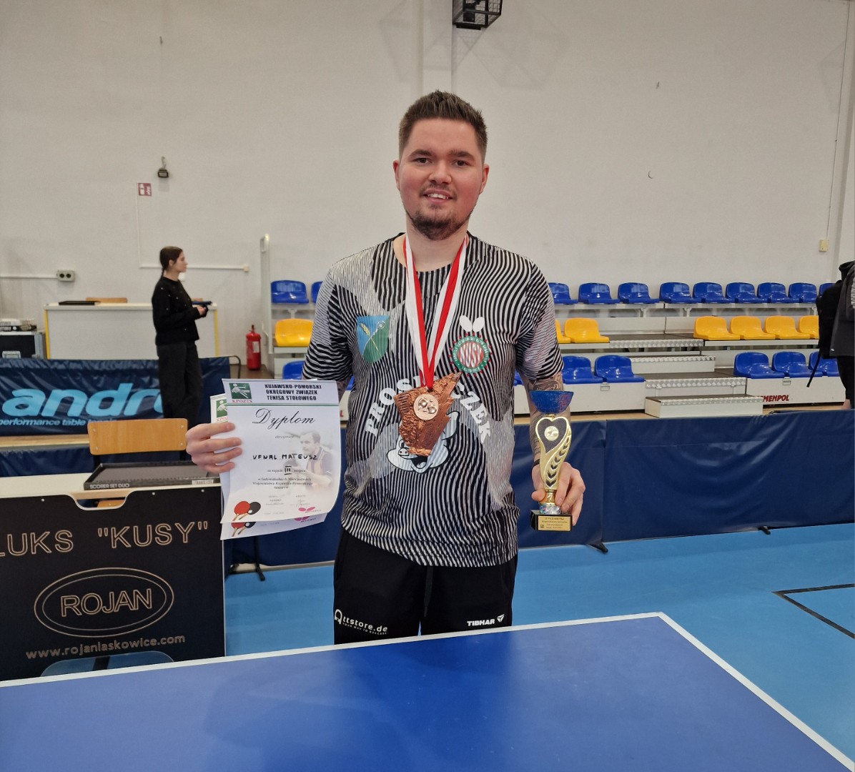 Mateusz Ufnal (Prosiaczek Kusy Laskowice) zdobył dwa medale podczas Mistrzostw Województwa Seniorów w tenisie stołowym, które odbyły się w Toruniu. Pierwszy wywalczył w grze pojedynczej zajmując ex aequo 3. miejsce z Miłoszem Rękasem (KS Nowa Era Toruń). Po złoto sięgnął Kacper Szurlej (Energa KTS Toruń), zaś srebro Tomasz Kotowski (niestowarzyszony). W półfinale Ufnal przegrał z Kotowskim. Rywalizowało 8 zawodników.