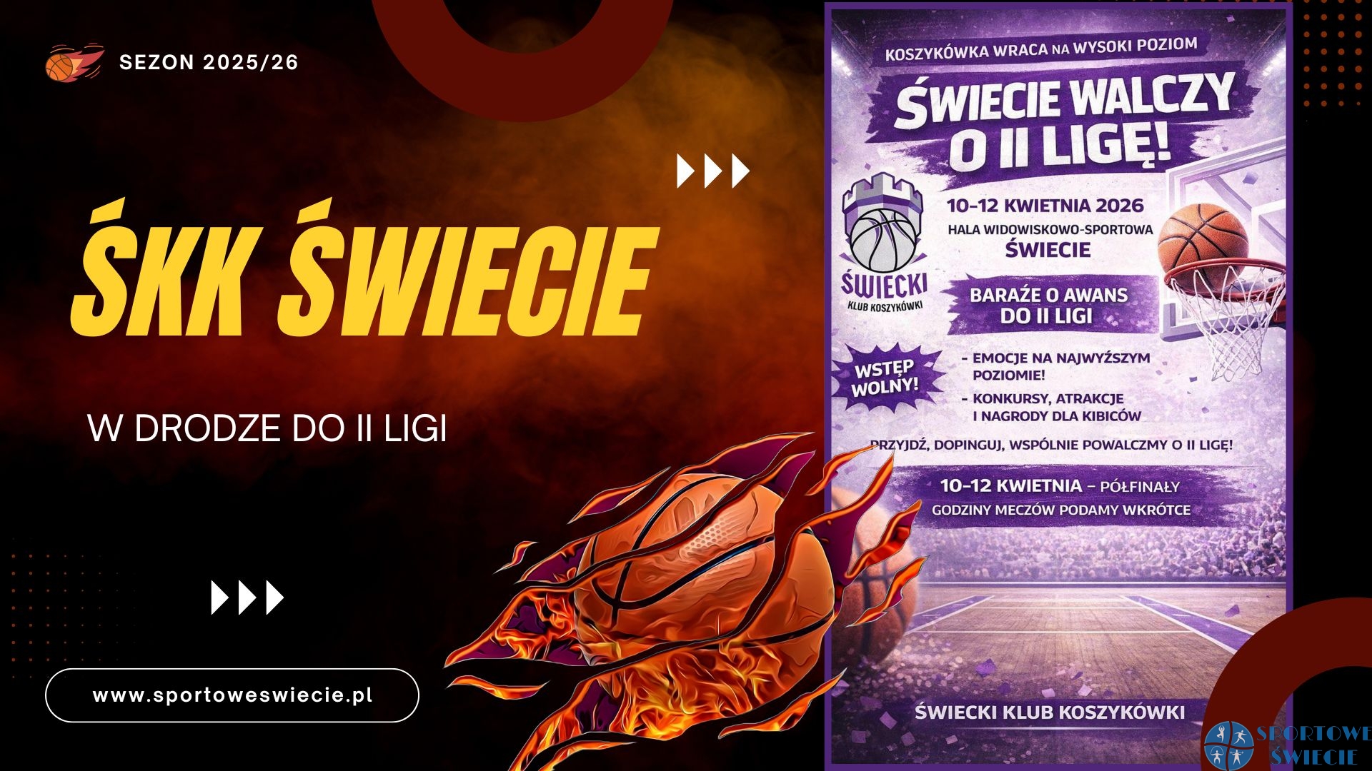 Świecki Klub Koszykówki będzie gospodarzem turnieju grupy „B” półfinału o wejście do II ligi. Jego rywalami będą kolejno Stokersi MUKS 1811 Unia Tarnów, KS Start Meble Dobrodzień i Defenders Kwidzyn. Turnieje zaplanowane są w dniach 10-12 kwietnia. Już dziś warto zarezerwować czas, by wesprzeć naszych koszykarzy dopingiem i pokazać, że na rozgrywki centralne jest zapotrzebowanie w naszym mieście. Hala widowiskowo-sportowa w Świeciu jest w tym sezonie twierdzą ŚKK, więc mamy nadzieję, że w tej kwestii nic się nie zmieni.