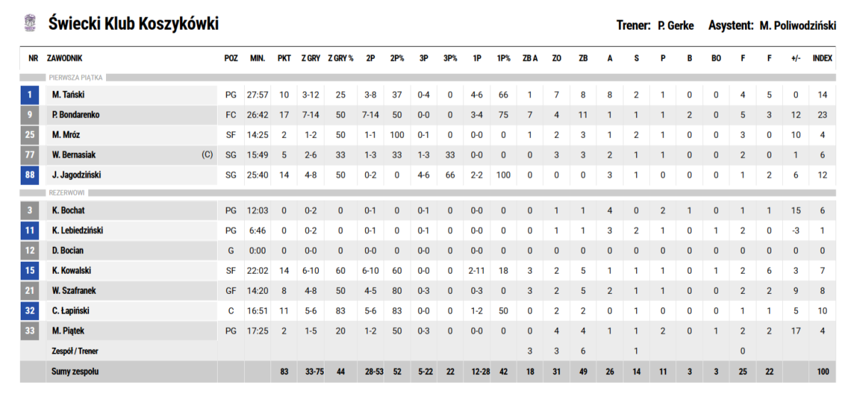 ŚKK: Tański 10, Bondarenko 17, Jagodziński 14 (4), Mróz 2, Bernasiak 5 (1) oraz Kowalski 14, Łapiński 11, Szafranek 8, Piątek 2, Bochat 0, Lebiedziński 0, Bocian.