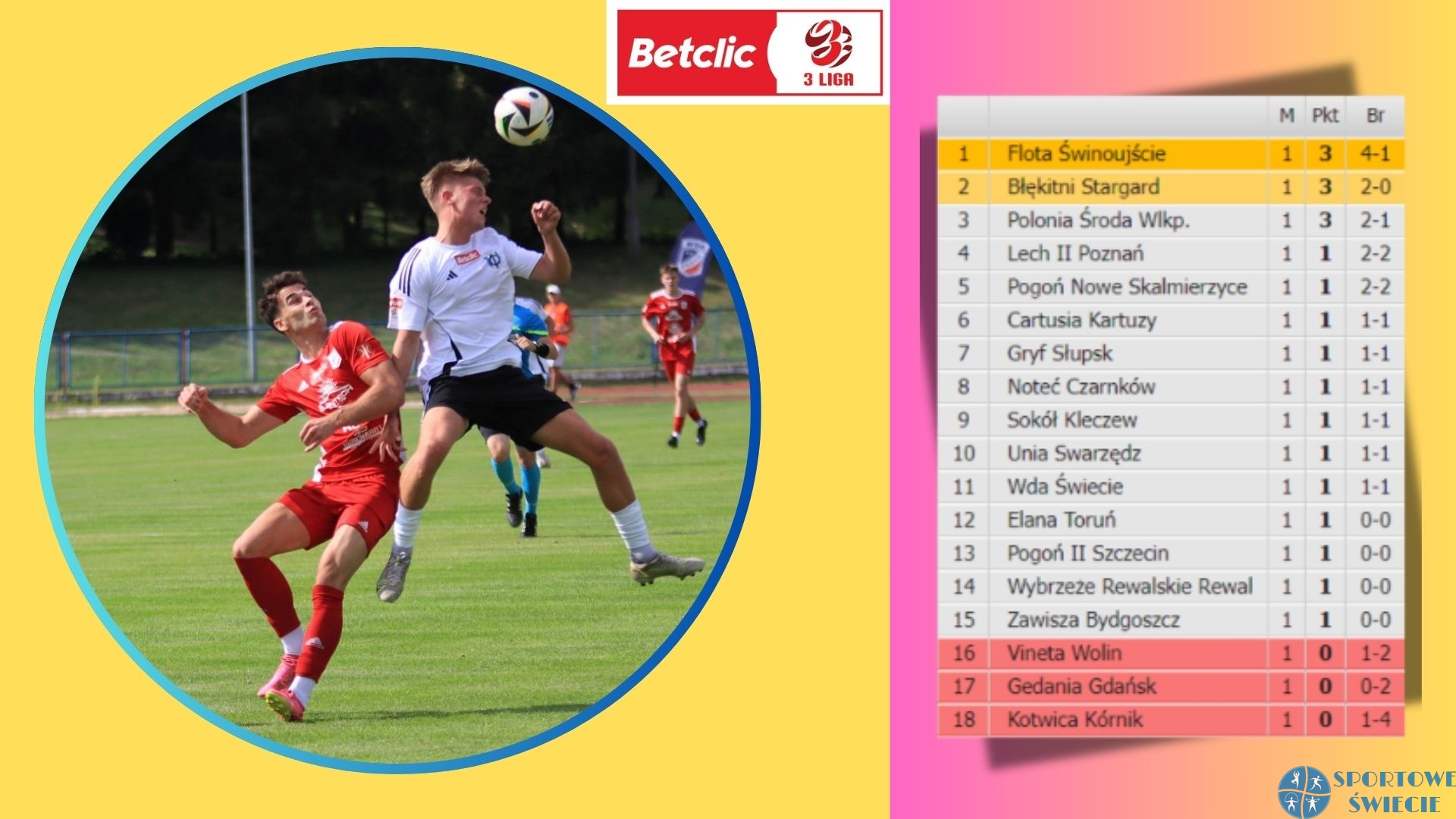 Inauguracja sezonu w grupie 2. Betclic 3. liga była remisowa, bo aż sześć spotkań zakończyło się podziałem punktów. Gospodarze nie odnieśli żadnego zwycięstwa. Z tych cieszyli się piłkarze ze Świnoujścia, Środy Wielkopolskiej i Stargardu. Pierwszym liderem została Flota Świnoujście, która wygrała z beniaminkiem Kotwicą Kórnik 4:1 (0:1). Wda zaczęła od przedziału miejsc 6-11.