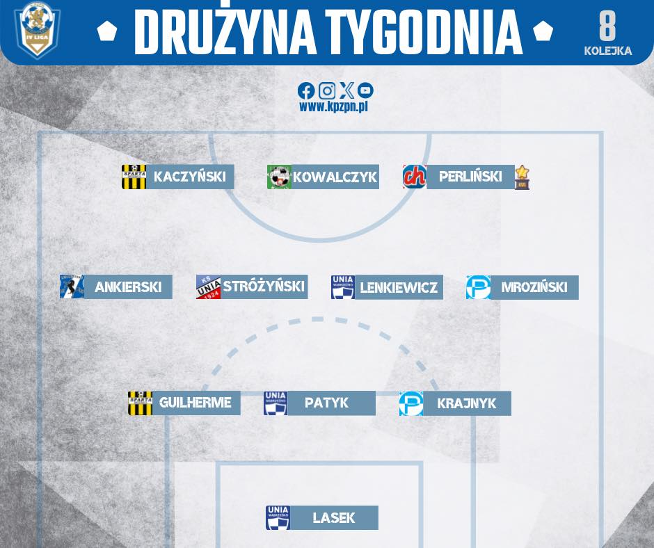 Natomiast w „Drużynie 8. kolejki IV ligi”, którą wybiera K-P ZPN, nie znalazł się żaden piłkarz Pomorzanina ani Startu/Eco-Pol Pruszcz. Za to są w niej przeciwnicy z boiska. MVP kolejki został uznany Patryk Perliński (Chemik Bydgoszcz). Nominacje do „jedenastki” otrzymali też strzelcy goli dla Pogoni Mogilno w Pruszczu (3:1) Antoni Krajnyk i Piotr Mroziński.
