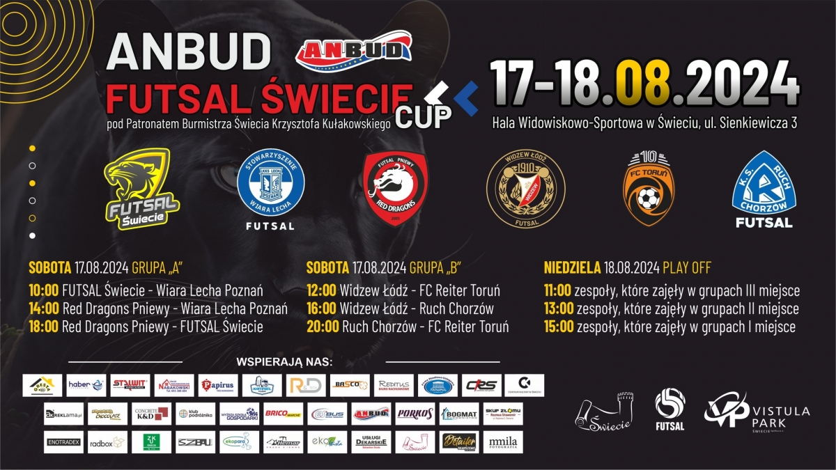 Nasz pierwszoligowiec po raz pierwszy organizuje turniej „Anbud Futsal Świecie Cup” pod patronatem burmistrza Krzysztofa Kułakowskiego. Jak już informowaliśmy na naszym portalu, weźmie w nim udział trzech przedstawicieli FOGO Futsal Ekstraklasa, dwaj pierwszoligowcy z grupy północnej i jeden z grupy południowej, notabene spadkowicz z elity. W wyniku losowania utworzono grupy eliminacyjne, w których rywalizacja będzie przez całą sobotę (sześć meczów). W grupie „A” zagrają Futsal Świecie, Wiara Lecha Poznań i Red Dragons Pniewy, zaś w „B” Widzew Łódź, Ruch Chorzów i FC Reiter Toruń. Rywalizacja ruszy w sobotę o godz. 10 pojedynkiem pierwszoligowców z grupy północnej Futsal Świecie – Wiara Lecha Poznań. Pantery będą miały okazję poznać beniaminka, który przygotowania do nowego sezonu zaczął znacznie później, bo 6 sierpnia. Poznaniacy dopiero w Świeciu będą mieli okazję zagrać pierwsze mecze kontrolne. W zespole z Wielkopolski po awansie zostało ośmiu piłkarzy. Do kadry dołączyło dziewięciu, w tym były reprezentant Polski i zawodnik Lecha Poznań Radosław Majewski. Drugie spotkanie pierwszoligowiec ze Świecia rozegra w sobotę o godz. 18 z „Czerwonymi Smokami” z Pniew, które w zeszłym sezonie zajęły 9. miejsce w ekstraklasie. Pozostałe mecze pierwszego dnia rozgrywane będą o godz. 12, 14, 16 i 20. Jedno spotkanie trwać będzie 2x 15 minut z zatrzymywanym czasem w przerwach w grze.