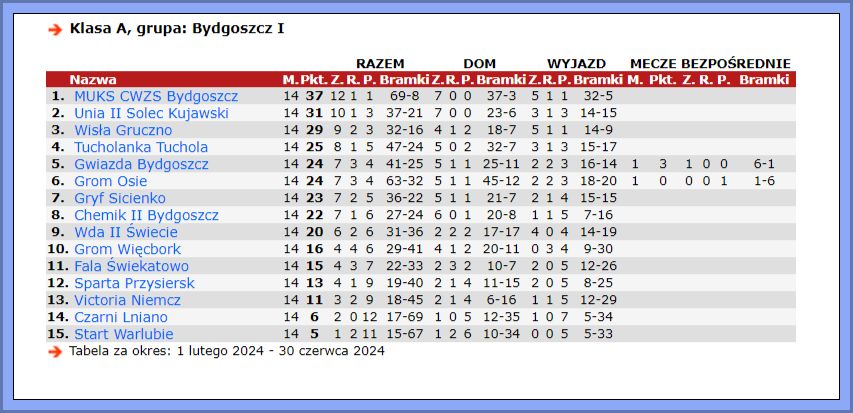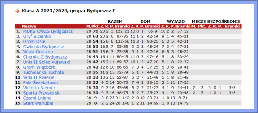 A-klasowcy z naszego powiatu zakończyli sezon 2023/24. Już przed ostatnią kolejką wiadomo było, że na najniższym stopniu podium będzie Grom Osie, który trzeci był też na półmetku rozgrywek. Wtedy tracił do drugiego w tabeli MUKS CWZS Bydgoszcz cztery punkty. Beniaminek ostatecznie okazał się zdecydowanie najlepszy w grupie 1. A klasy, a na finiszu rozgrywek wyprzedził mistrza jesieni Gryf Sicienko o 9 punktów (po 1. rundzie tracił pięć), zaś Grom aż o 17. Osianie w rewanżach zagrali nieco słabiej, zdobyli o sześć „oczek” mniej niż jesienią. Na koniec ulegli na wyjeździe Tucholance Tuchola 1:3 (0:0). Największą niespodzianką rewanżów jest postawa zespołu z Sicienka, który jesienią zdobył 39 pkt, zaś wiosną zaledwie 23. Gryf w środę zacznie baraż o wejście do klasy okręgowej, a jego rywalem będzie Gol Brodnica.
