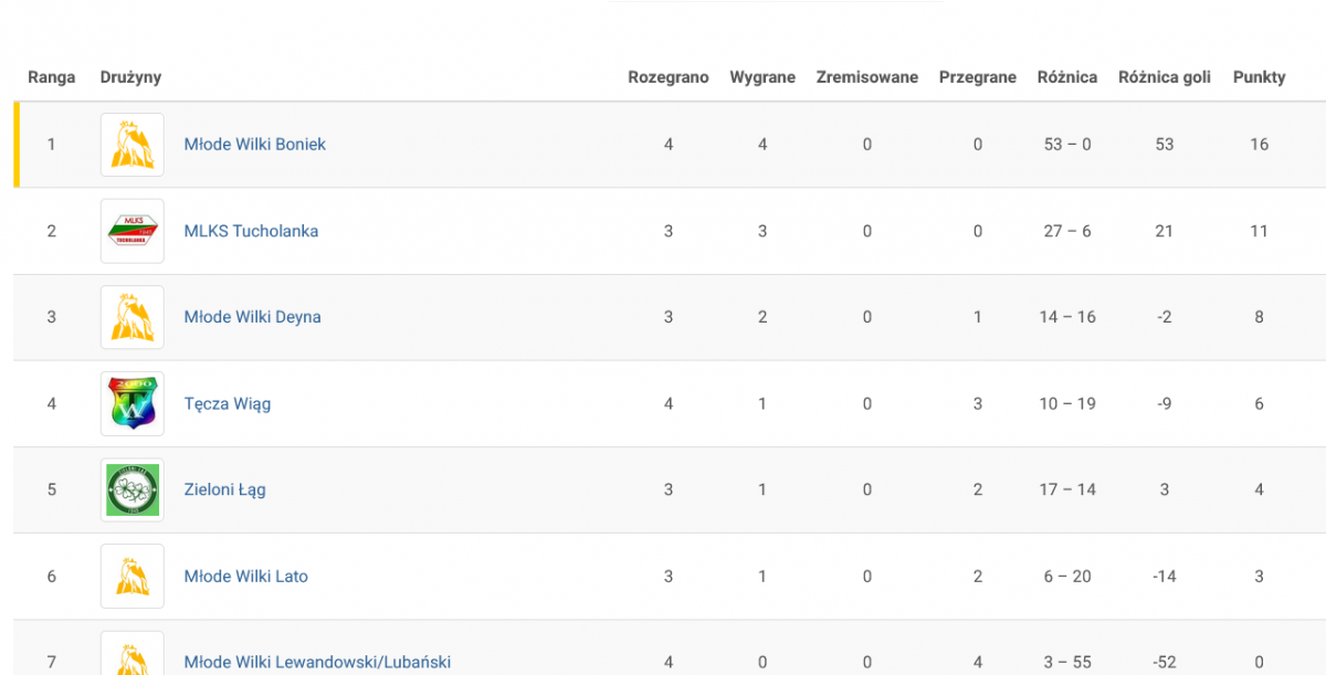 Młode Wilki Boniek umocniły się na 1. miejscu w tabeli Młodzieżowej Ligi Wilka. Lider zgodnie z planem ograł Tęczę Wiąg 8:0, a także bezbłędnie egzekwował rzuty karne, czyli czwarty raz w tym sezonie zgarnął komplet czterech punktów. Niespodziewanie pierwsze „oczko” zgubił wicelider. Tucholanka Tuchola wysoko pokonała Młode Wilki Deyna 12:0, ale przegrała rzuty karne 2:3.