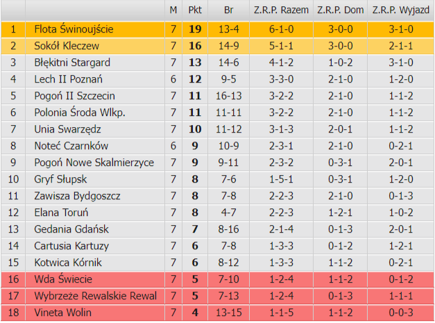 Rozczarowali dwaj inni trzecioligowcy z Kujawsko-Pomorskiego. Zawisza Bydgoszcz przegrał w Środzie Wielkopolskiej z Polonią 2:3 (0:1). To już jego trzecia porażka wyjazdowa. Bydgoszczanom nie pomógł pozyskany napastnik Patryk Mikita, mistrz Polski z Legią Warszawa z 2014 roku. W debiucie zdobył on gola na 2:3, ale na więcej jego i kolegów w sobotę nie było stać. Zawisza w siedmiu meczach zdobył tylko 8 pkt, co na pewno jest dużą niespodzianką in minus tych rozgrywek. Z kolei Elana Toruń u siebie uległa w niedzielę Błękitnym Stargard 0:2 (0:1). Mecz ustawił gol strzelony w 14. min. z dystansu przez Macieja Ignasiaka. Torunianie dążyli do 90. min. do wyrównania, ale bez powodzenia. Ich nadzieje na choćby punkt zgasił w doliczonym czasie gry Damian Niedojad-Bednarczyk. Dodajmy, że Błękitni świetnie spisują się w delegacjach. To była ich trzecia wygrana, a do tego mają remis. Takim bilansem może pochwalić się jeszcze Flota Świnoujście, która wciąż jest niepokonanym liderem. W sobotę znów jeden gol wystarczył jej do pokonania beniaminka na jego stadionie. Tym razem Gryfa Słupsk, dla którego jest to pierwsza przegrana po awansie do III ligi.