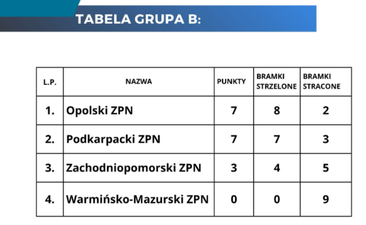 Grupa „B”: Opolski ZPN – Podkarpacki ZPN 2:2 (0:0) – w rzutach karnych 1:3, Zachodniopomorski ZPN – Warmińsko-Mazurski ZPN 3:0 wo., Podkarpacki ZPN – Zachodniopomorski ZPN 2:1, Warmińsko-Mazurski ZPN – Opolski ZPN 0:3 wo., Opolski ZPN – Zachodniopomorski ZPN 3:0 (1:0), Warmińsko-Mazurski ZPN – Podkarpacki ZPN 0:3 wo.