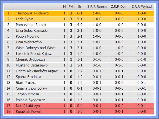 Tłuchowia Tłuchowo najlepiej wystartowała z czwartoligowców gromiąc w Kowalu miejscowego Kujawiaka 6:1 (1:1). Faworyt jednak dopiero na początku 2. połowy znalazł sposób na beniaminka strzelając między 48. a 55. min. trzy gole. Później dołożył jeszcze dwa. Efektowną inaugurację zaliczył także Lech Rypin, który rozbił w niedzielę w Bydgoszczy Polonię 5:1 (3:0). Tutaj już do przerwy losy wyniku były rozstrzygnięte. Udany debiut w nowych barwach zaliczył dobrze znany u nas Łukasz Chruścicki strzelając dwie bramki. Podium po 1. kolejce zamyka Pol-Osteg/Pomorzanin Serock, który rozgromił Noteć Łabiszyn 4:0 (2:0). Wygrana nie jest niespodzianką, ale jej rozmiary już tak. Tym bardziej, że od 55. min. serocczanie grali w „10”, a mimo to potrafili dołożyć dwa gole. Goście mieli sporo pretensji do sędziego, który podyktował ich zdaniem kontrowersyjne rzuty karne dla Pomorzanina, a faulu w „16” na Ebrima Mbye nie widział.