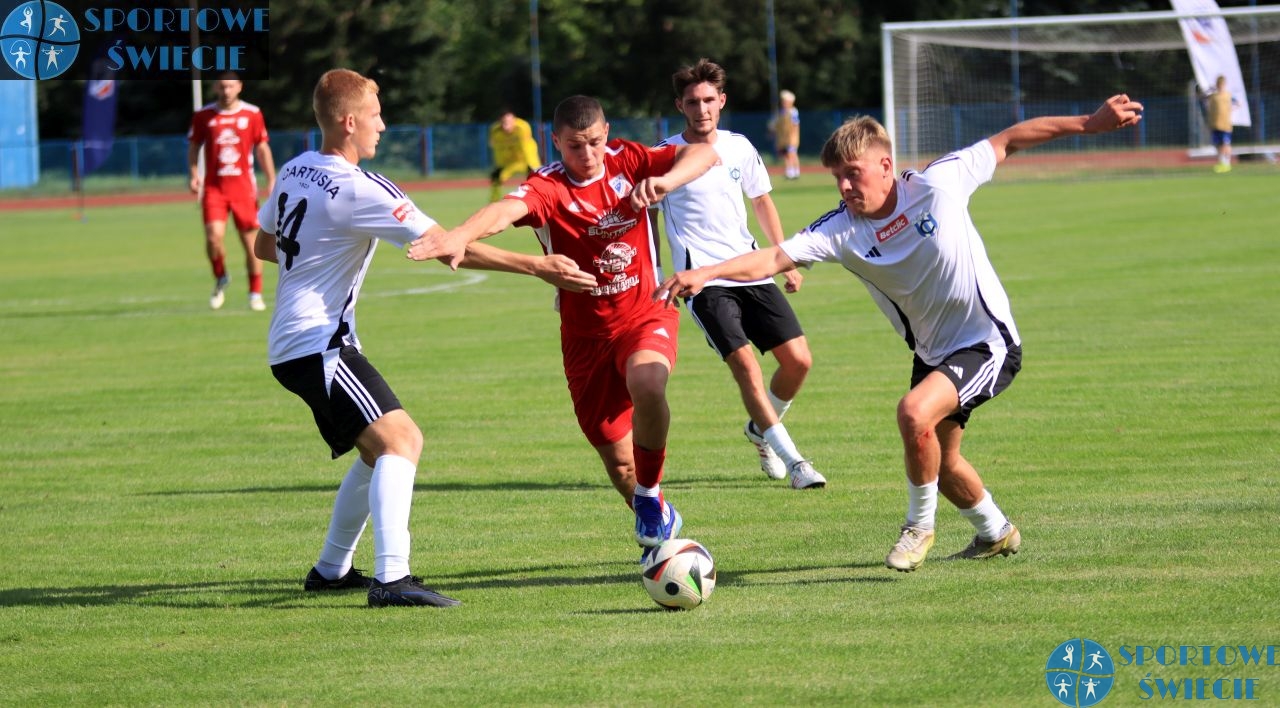 Wda Świecie zremisowała z Cartusią 1932 Kartuzy 1:1 (0:0) w pierwszym meczu III ligi (grupa 2.) w sezonie 2024/25. Trener Krzysztof Urtnowski do gry desygnował taką samą „11” jak w ostatnim sparingu. Znalazło się w niej tylko miejsce dla dwóch debiutantów, tj. Mikołaja Dziarkowskiego i Jakuba Nawrockiego. W 1. części lepsze sytuacje wypracowali sobie goście. W 18. min. piłka znalazła się w bramce świecian, ale wcześniej Bartosz Nowacki sfaulował Łukasza Zapałę, więc arbiter nie uznał gola i ukarał zawodnika Cartusii żółtą kartką. W 26. min. Oktawian Skrzecz wywalczył rzut karny. Jednak Marcin Poręba go nie wykorzystał, bo golkiper Wdy wyczuł jego intencje strzeleckie. Pięć minut później „Zapi” znów popisał się kapitalną interwencją broniąc kąśliwy strzał Nowackiego. Wda do przerwy miała dwie groźniejsze sytuacje. W 14. min. Michał Kalitta na raty próbował zaskoczyć bramkarza Cartusii Mateusza Ryszewskiego, ale najpierw golkiper umiejętnie skrócił kąt strzału, a przy drugiej próbie napastnika Wdy dobrze interweniował. Tuż przed przerwą król strzelców IV ligi poprzedniego sezonu miał jeszcze jedną szansę, ale przestrzelił z 14 metrów. Poza tym próbowali z dystansu Oskar Kubiak i Tymoteusz Majka, jednak ich strzały nie sprawiły problemu Ryszewskiemu.