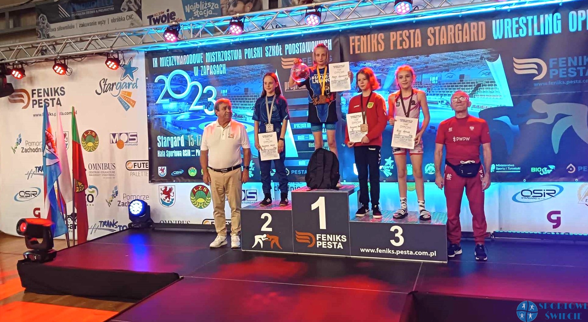 Reprezentanci powiatu świeckiego powrócili w doskonałych humorach z Międzynarodowych Mistrzostw Polski Szkół Podstawowych w zapasach, które odbyły się w miniony weekend w Stargardzie. Zawodnicy Wisły Świecie i Suplesu Lniano zdobyli po złocie, srebrze i brązu. Na podium stanął też młodzik z Jeżewa Hubert Dalak (GLUKS Invictus Sicienko), który zdobył brązowy medal w wadze 52 kg. Przegrał jedynie z późniejszym złotym medalistą z Białogardu. Po mistrzowskie tytuły sięgnęli młodziczka Małgorzata Bonna (Suples Lniano, 36 kg) i debiutujący w zawodach rangi mistrzowskiej Angelo Siwak (Wisła Świecie, 75 kg).