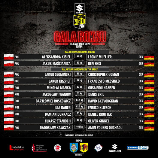 Pięściarz Wdy Świecie Jakub Słomiński po raz kolejny będzie miał okazję powalczyć w Suzuki Boxing Night. Poprzednio miało to miejsce we wrzesniowej 17. edycji w Łomży, gdzie pokonał przed czasem Rumuna Roberta Patera Adalberta. Teraz w Rypinie dojdzie do meczu Polska – Niemcy. Przewidzianych jest 10 walk, w tym po dwie w wagach 57 kg, 63,5 kg i 80 kg. Przed nimi odbędzie się pojedynek pań, w którym Aleksandra Kisiel zmierzy się z Leonie Mueller. Jakub Słomiński (51 kg) otworzy walki transmitowane przez TVP Sport. Zmierzy się z doskonale znanym sobie Christopherem Gomanem, z którym w zeszłym roku wygrał podczas Suzuki Boxing Night 11 w Chęcinach oraz później podczas Grand Prix w Usti nad Łabą (Czechy). Mamy nadzieję, że w piątek też będzie lepszy. Poza Słomińskim nasz kraj reprezentować będą także: Jakub Krzpiet (54 kg), Jarosław Iwanow i Mikołaj Mańka (obaj 57 kg), Ilia Bader i Bartłomiej Rośkowicz (obaj 63,5 kg), Damian Durkacz (71 kg), Łukasz Stanioch i Jakub Maścianica (obaj 80 kg), Radosław Kawczak (+92 kg). Transmisja w TVP Sport rozpocznie się w piątek o godz. 20.