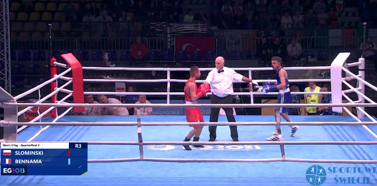 W 1/4 finału wagi 51 kg Jakub Słomiński przegrał z Francuzem Billalem Bennama przez dyskwalifikację. Sędzia ringowy ukarał w 2. rundzie dwoma ostrzeżeniami Polaka za niedozwolone ataki głową, a w połowie ostatniej rundy trzecim, co oznaczało zakończenie walki. Bokser z Francji to trzykrotny medalista Mistrzostw Świata, aktualny wicemistrz w wadze 54 kg. Dysponował on lepszymi warunkami fizycznymi. W pierwszych dwóch rundach wypracował sobie sporą przewagę punktową. Po 1. rundzie sędziowie wskazali 3x 10:9 i 2x 10:8 dla niego, a w drugiej 4x 10:9 i raz 10:8.